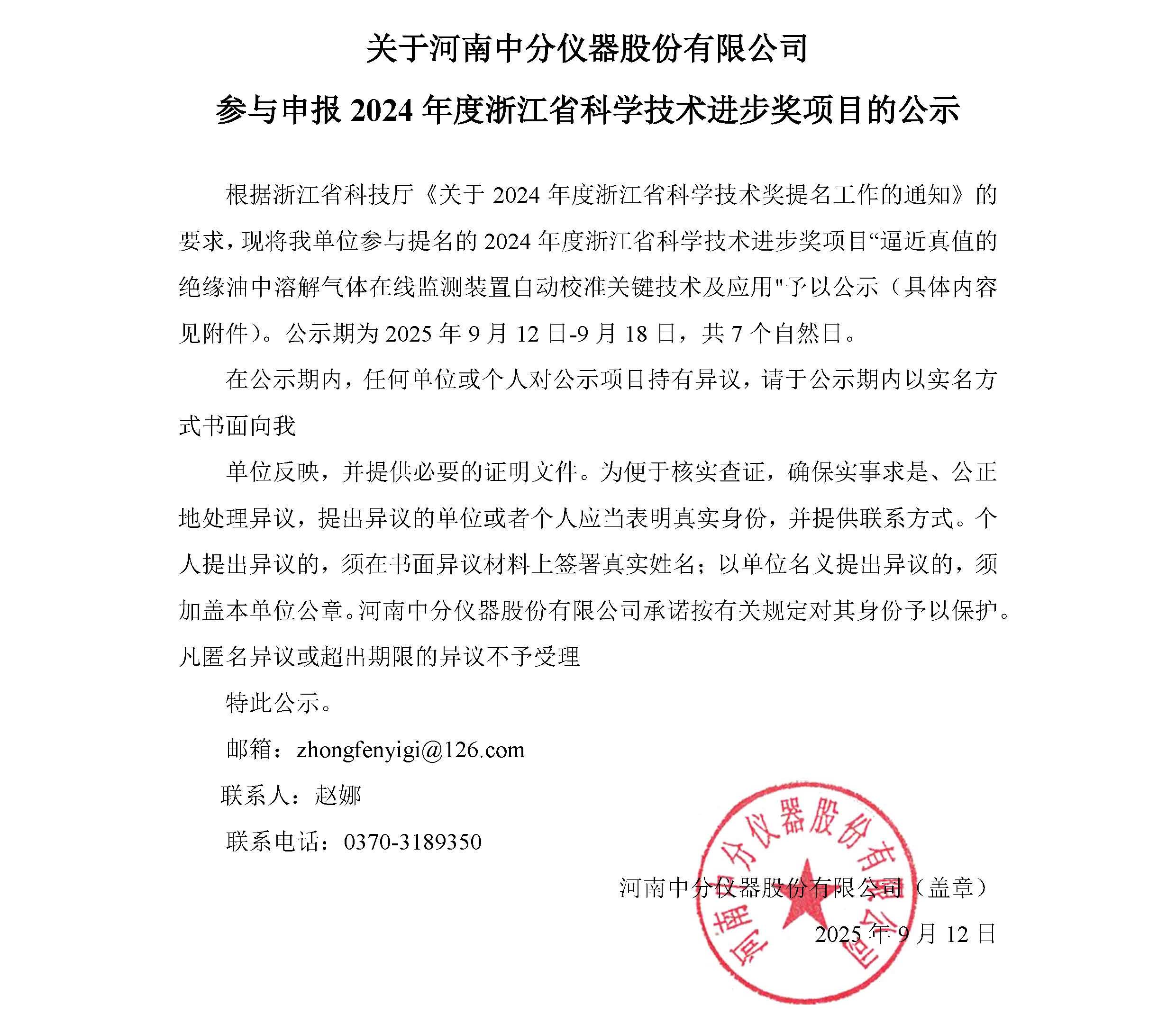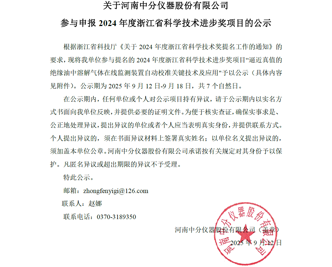 關(guān)于河南中分儀器股份有限公司參與申報2024年度浙江省科學(xué)技術(shù)進步獎項目的公示